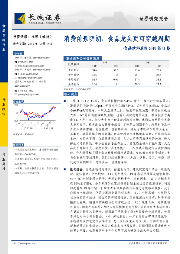 【长城证券】【20190318】20190318-长城证券-食品饮料周报2019第11期:消费前景明朗,食品龙头更可穿越周期-12页