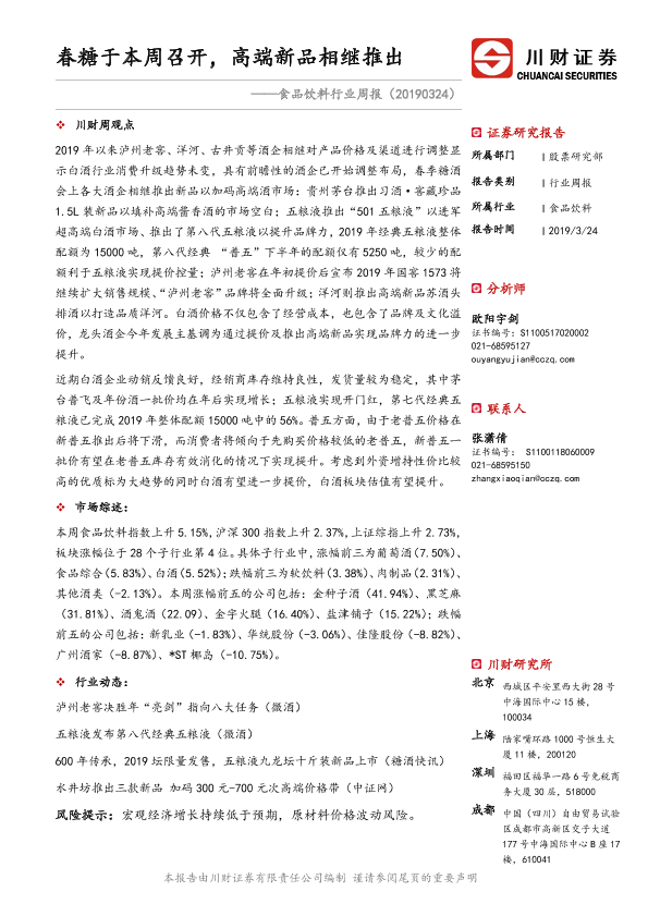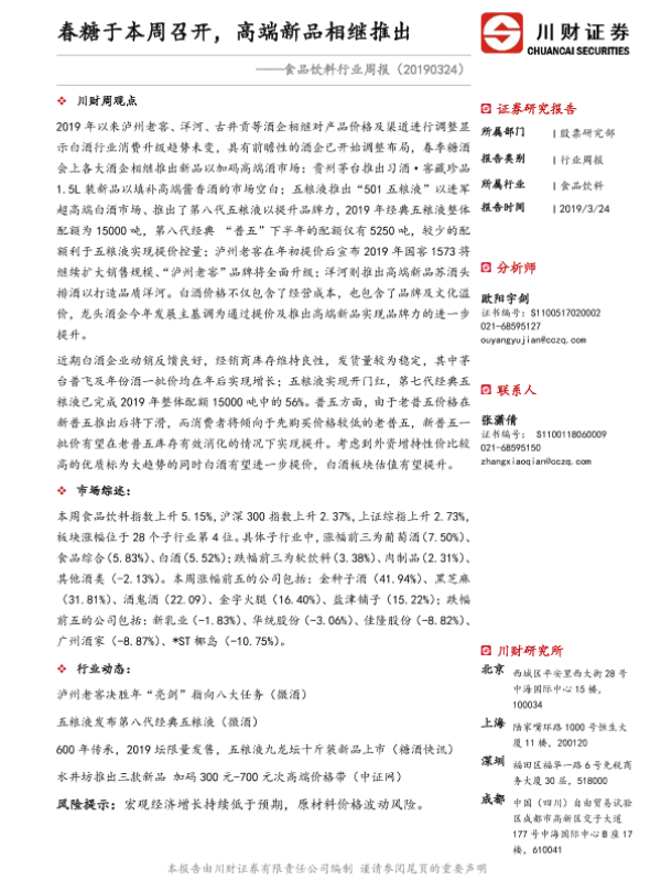 【川财证券】【20190324】20190324-川财证券-食品饮料行业周报:春糖于本周召开,高端新品相继推出-14页