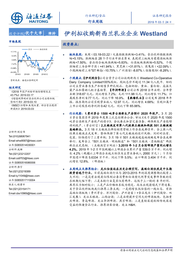 【海通证券】【20190324】食品行业周报:伊利拟收购新西兰乳业企业Westland-13页