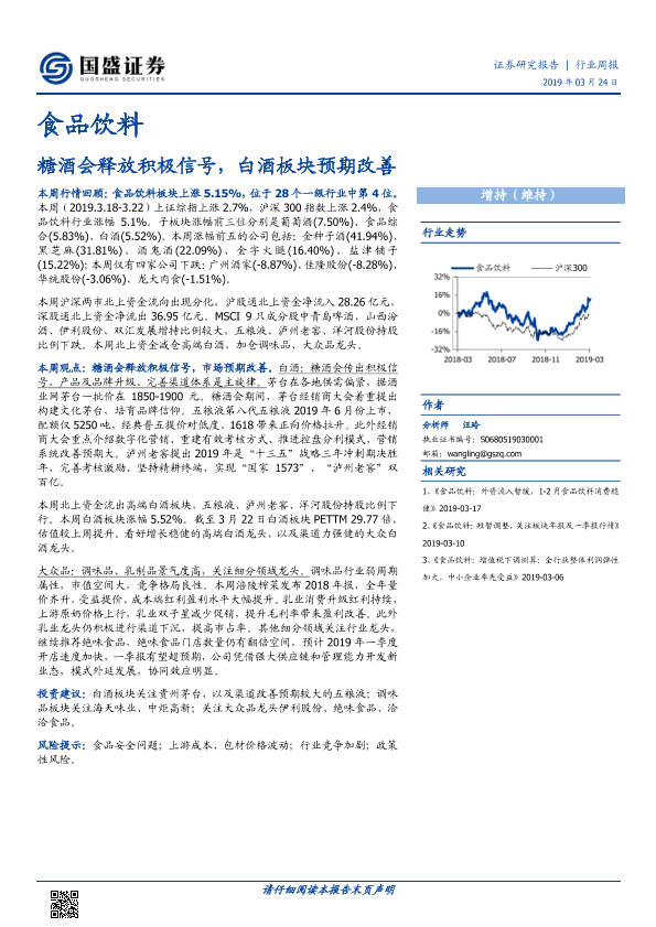 【国盛证券】【20190324】20190324-国盛证券-食品饮料行业周报:糖酒会释放积极信号,白酒板块预期改善-18页