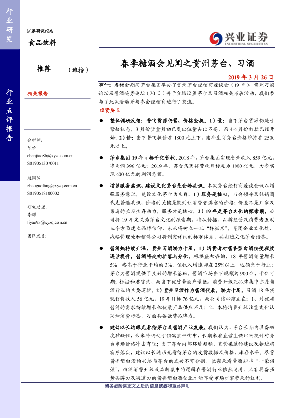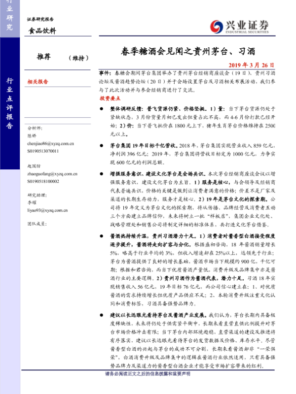 【兴业证券】【20190326】20190326-兴业证券-食品饮料行业点评报告:春季糖酒会见闻之贵州茅台、习酒-4页
