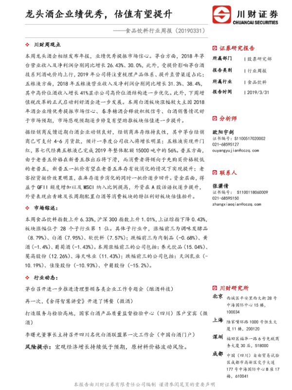 【川财证券】【20190331】食品饮料行业周报:龙头酒企业绩优秀,估值有望提升-13页
