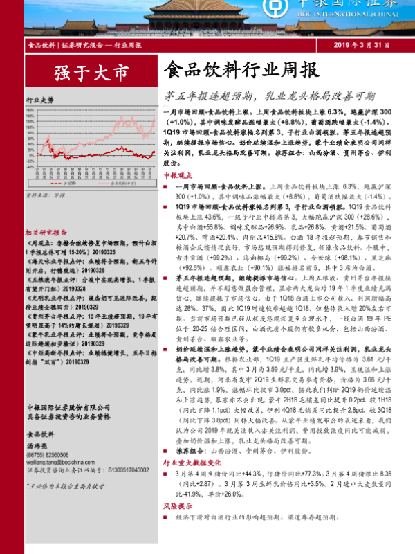 【中银证券】【20190331】20190331-中银证券-食品饮料行业周报:茅五年报连超预期,乳业龙头格局改善可期-21页