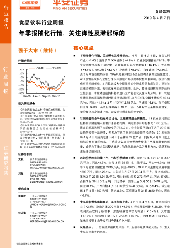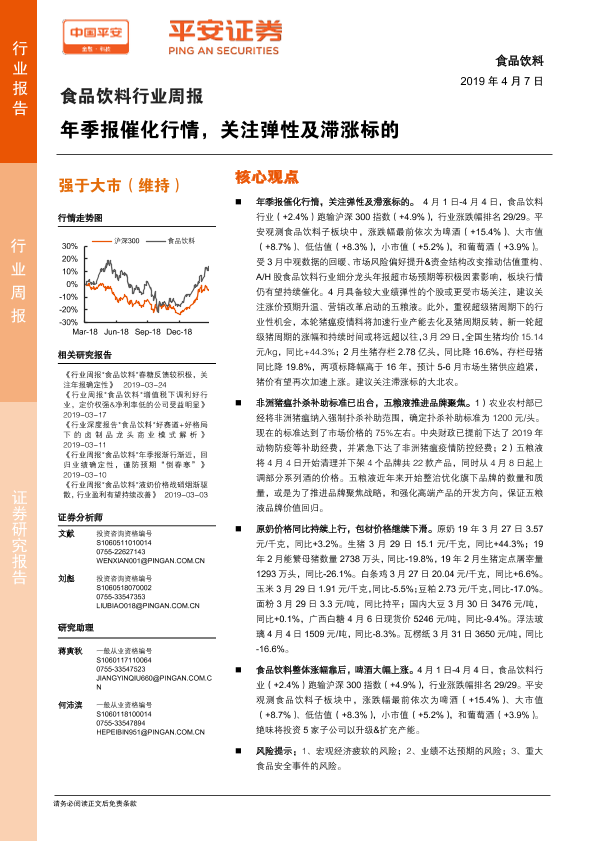 【平安证券】【20190407】食品饮料行业周报:年季报催化行情,关注弹性及滞涨标的-6页
