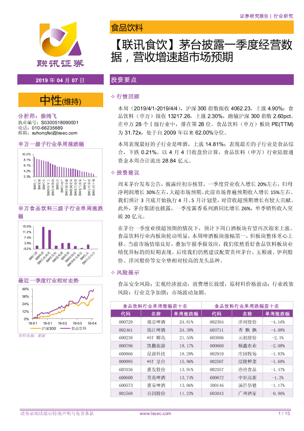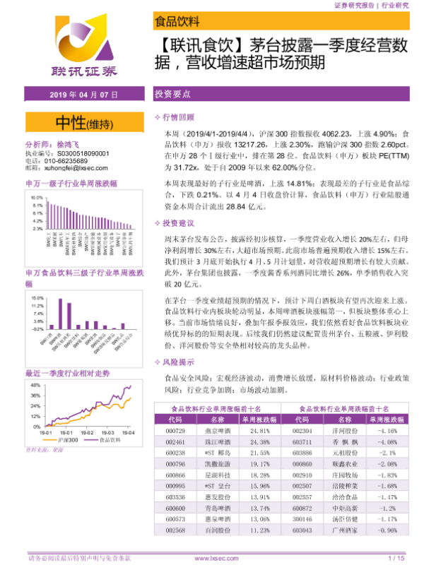 【粤开证券】【20190407】茅台披露一季度经营数据,营收增速超市场预期-15页