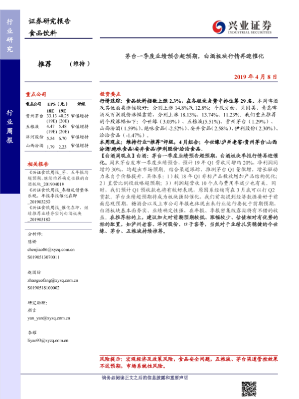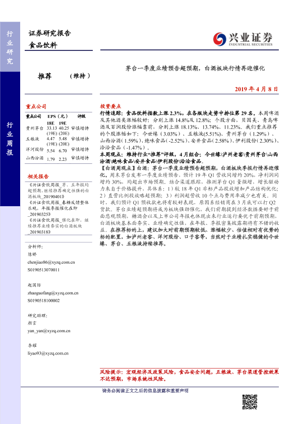 【兴业证券】【20190408】20190408-兴业证券-食品饮料行业周报:茅台一季度业绩预告超预期,白酒板块行情再迎催化-14页