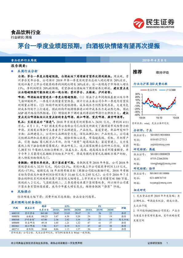 【民生证券】【20190408】20190408-民生证券-食品饮料行业周报:茅台一季度业绩超预期,白酒板块情绪有望再次提振-18页