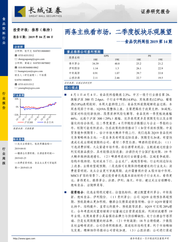 【长城证券】【20190408】20190408-长城证券-食品饮料周报2019第14期:两条主线看市场,二季度板块乐观展望-14页
