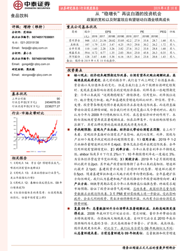 【中泰证券】【20190410】食品饮料行业深度报告:从“稳增长”再议白酒的投资机会 政策的宽松以及财富效应有望驱动白酒业绩高成长-18页
