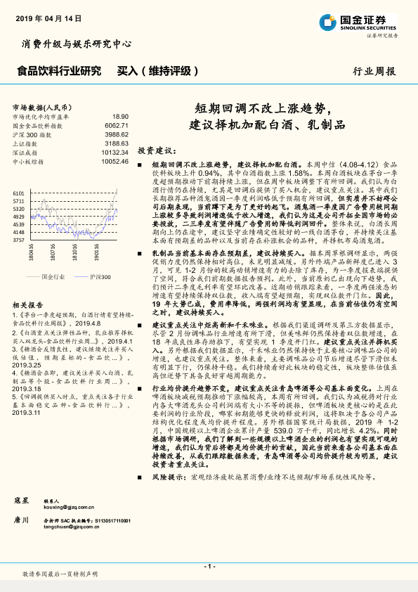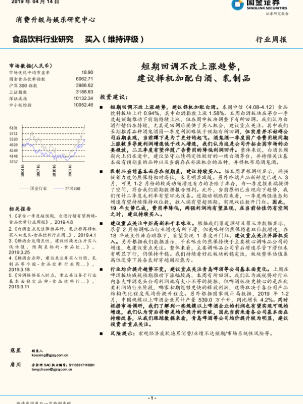 【国金证券】【20190414】20190414-国金证券-食品饮料行业研究周报:短期回调不改上涨趋势,建议择机加配白酒、乳制品-22页
