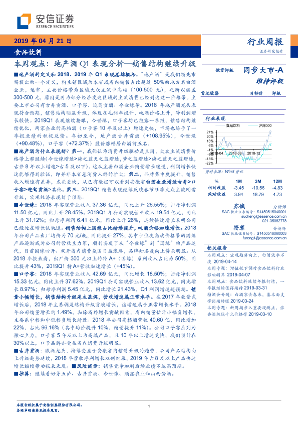 【安信证券】【20190421】20190421-安信证券-食品饮料本周观点:地产酒Q1表现分析—销售结构继续升级-28页