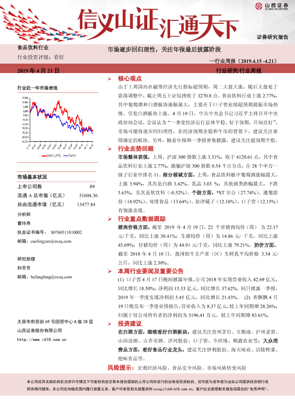 【山西证券】【20190421】20190421-山西证券-食品饮料行业周报:市场逐步回归理性,关注年报最后披露阶段-11页