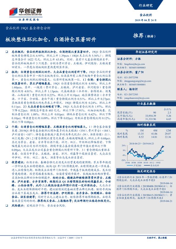 【华创证券】【20190424】食品饮料19Q1基金持仓分析:板块整体环比加仓,白酒持仓显著回升-11页