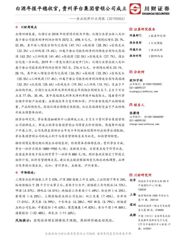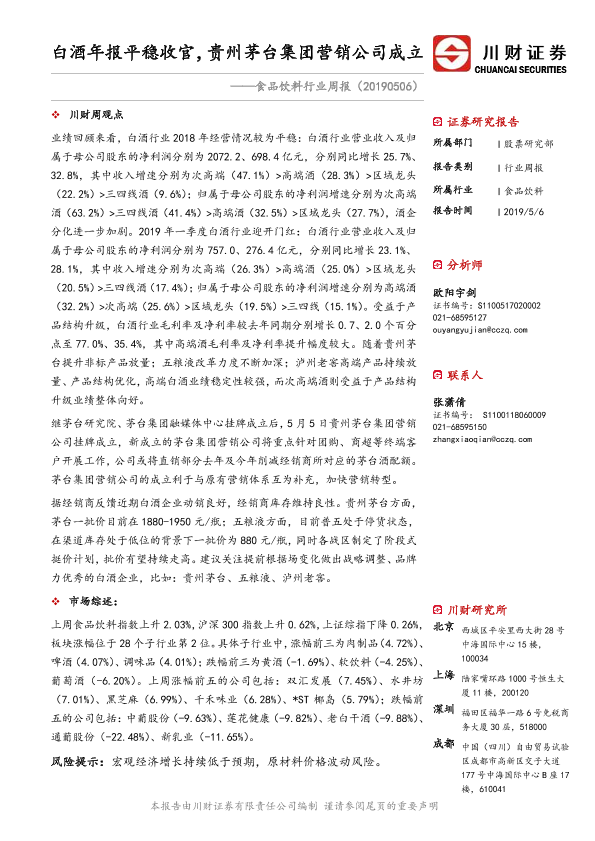 【川财证券】【20190506】食品饮料行业周报:白酒年报平稳收官,贵州茅台集团营销公司成立-13页