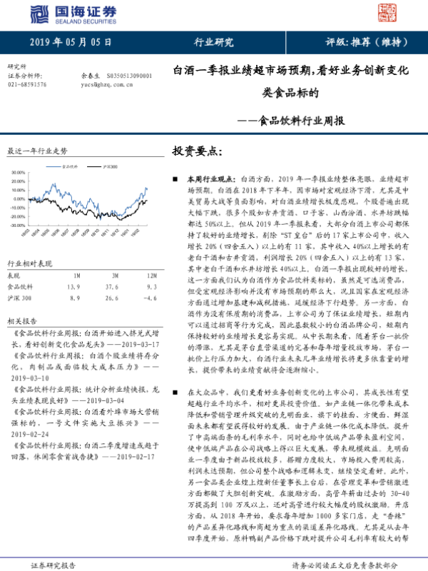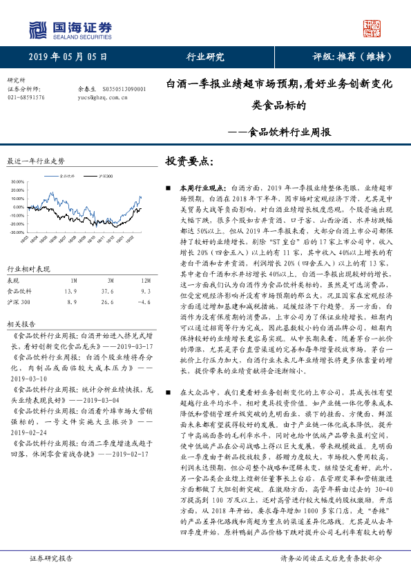 【国海证券】【20190505】食品饮料行业周报:白酒一季报业绩超市场预期,看好业务创新变化类食品标的-24页