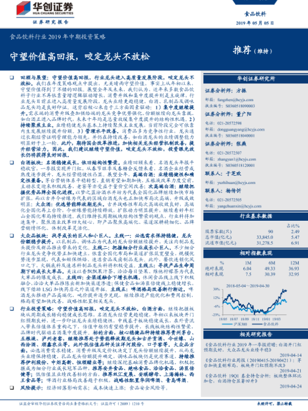 【华创证券】【20190505】食品饮料行业2019年中期投资策略:守望价值高回报,咬定龙头不放松-49页