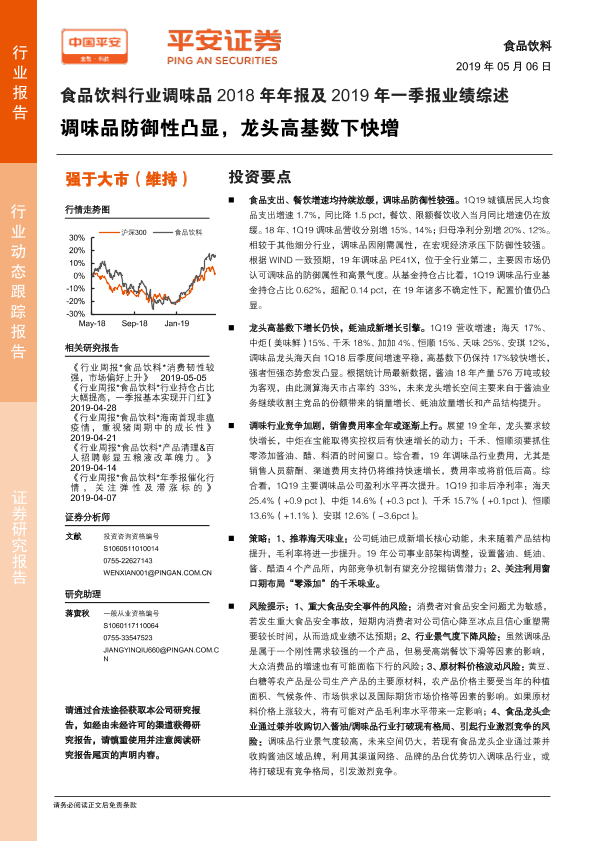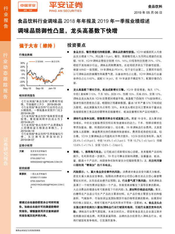 【平安证券】【20190506】食品饮料行业调味品2018年年报及2019年一季报业绩综述:调味品防御性凸显,龙头高基数下快增-14页