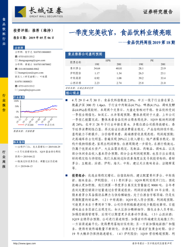 【长城证券】【20190506】20190506-长城证券-食品饮料周报2019第18期:一季度完美收官,食品饮料业绩亮眼-14页
