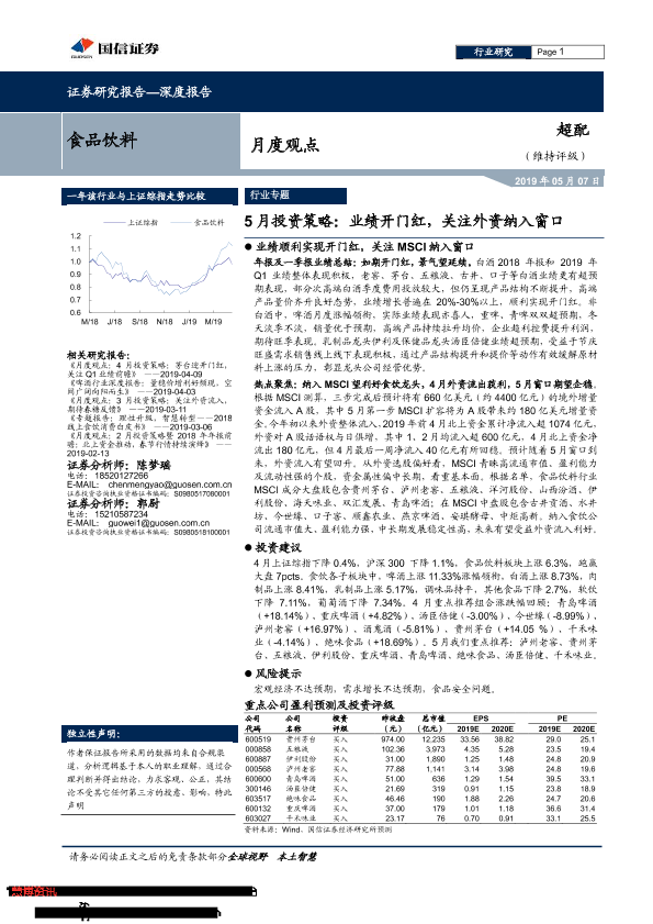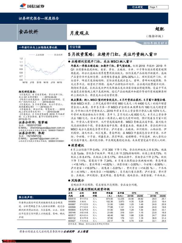 【国信证券】【20190507】20190507-国信证券-食品饮料行业月度观点:5月投资策略:业绩开门红,关注外资纳入窗口-20页