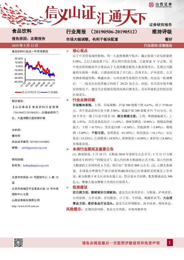 【山西证券】【20190512】20190512-山西证券-食品饮料行业周报:市场大幅调整,有利于板块配置-10页