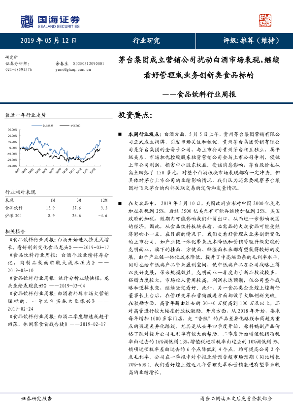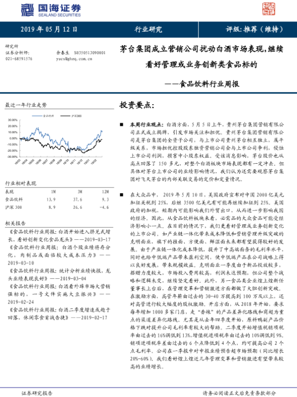 【国海证券】【20190512】20190512-国海证券-食品饮料行业周报:茅台集团成立营销公司扰动白酒市场表现,继续看好管理或业务创新类食品标的-22页