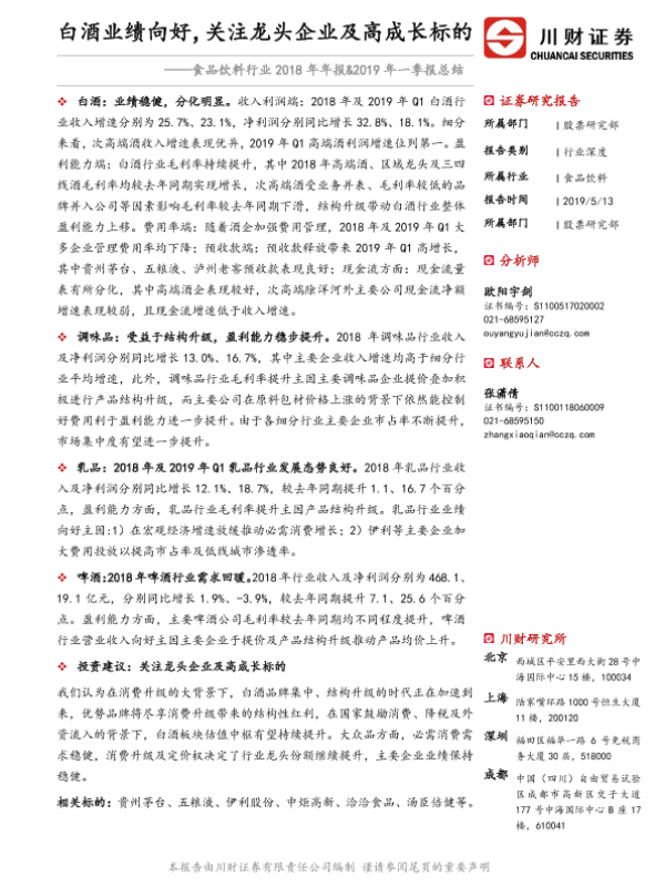 【川财证券】【20190513】食品饮料行业2018年年报&2019年一季报总结:白酒业绩向好,关注龙头企业及高成长标的-25页