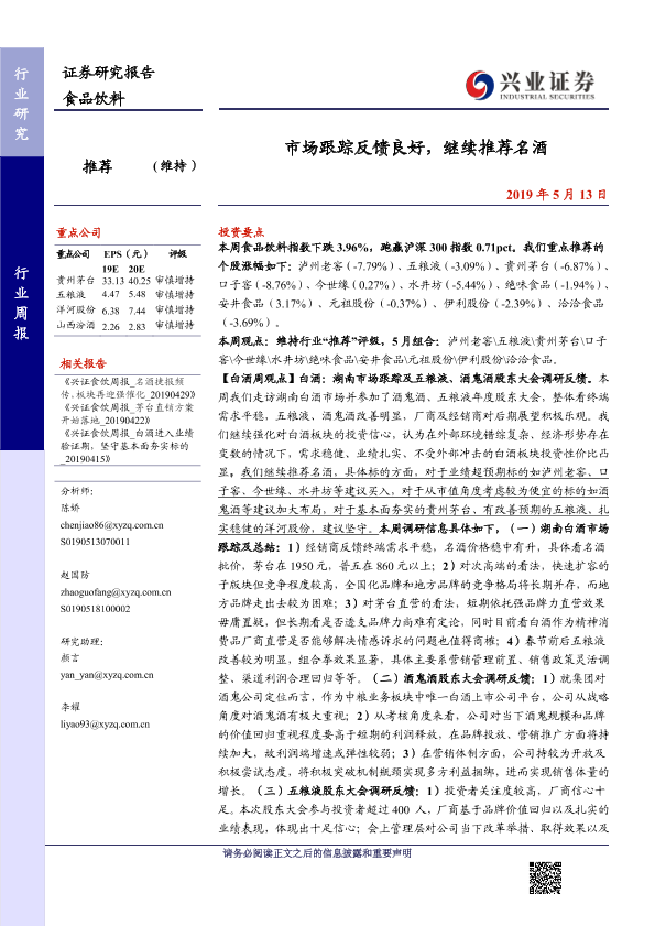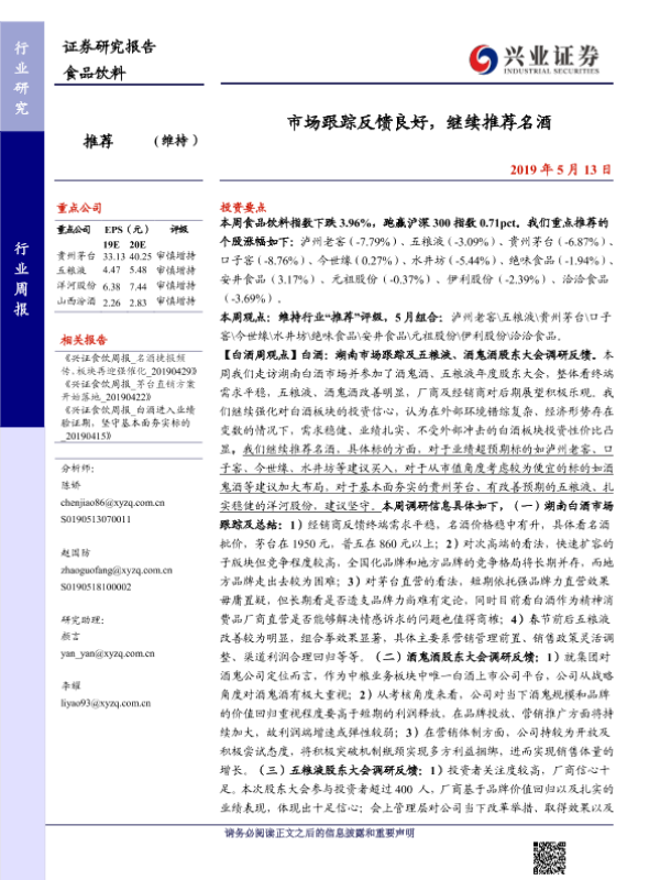 【兴业证券】【20190513】20190513-兴业证券-食品饮料行业周报:市场跟踪反馈良好,继续推荐名酒-17页