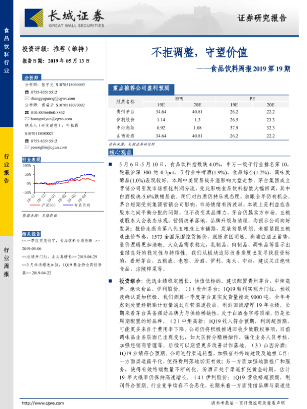 【长城证券】【20190513】20190513-长城证券-食品饮料周报2019第19期:不拒调整,守望价值-13页