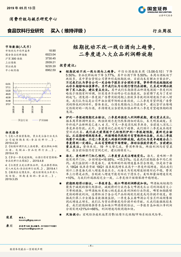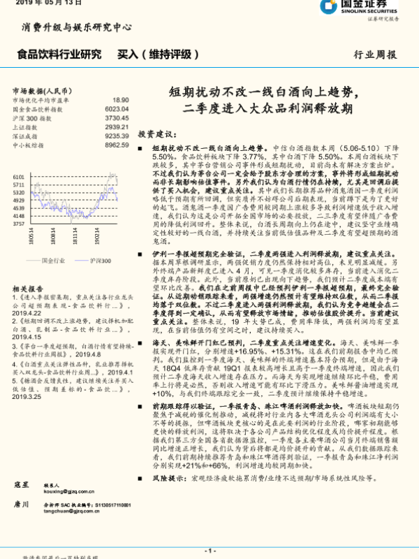 【国金证券】【20190513】20190513-国金证券-食品饮料行业研究周报:短期扰动不改一线白酒向上趋势,二季度进入大众品利润释放期-21页