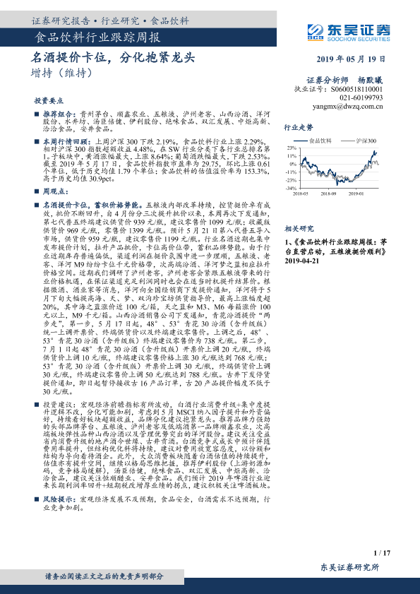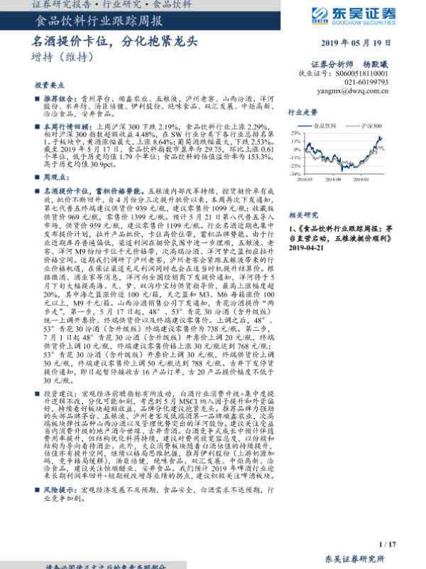 【东吴证券】【20190519】食品饮料行业跟踪周报:名酒提价卡位,分化抱紧龙头-17页