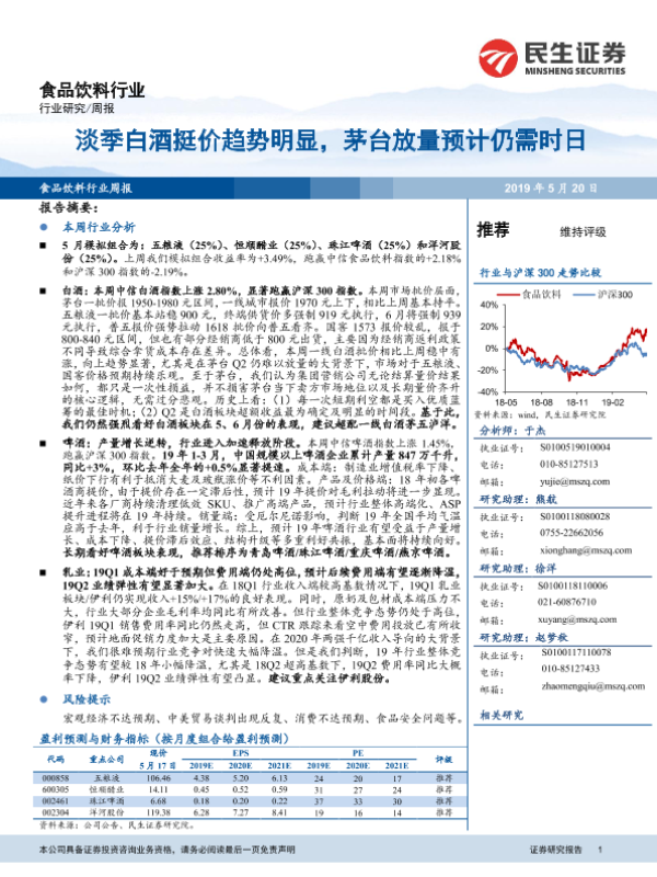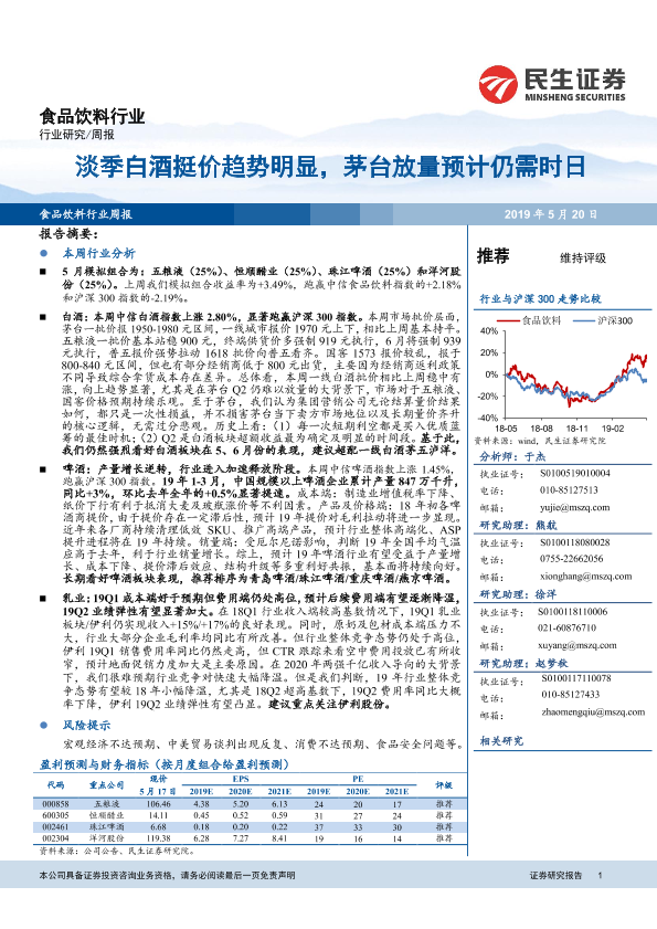 【民生证券】【20190520】20190520-民生证券-食品饮料行业周报:淡季白酒挺价趋势明显,茅台放量预计仍需时日-20页