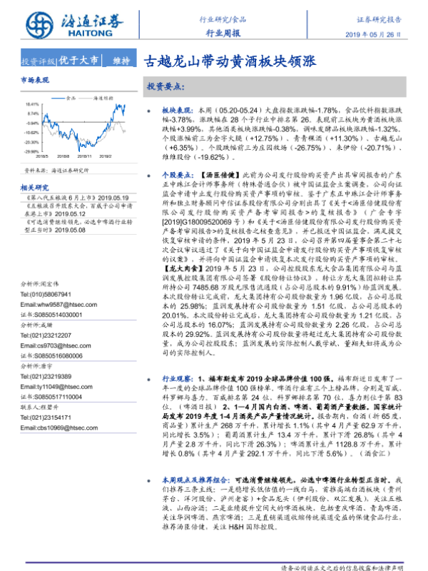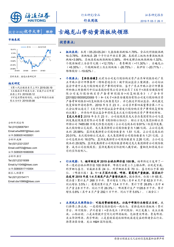 【海通证券】【20190526】20190526-海通证券-食品行业周报:古越龙山带动黄酒板块领涨-12页