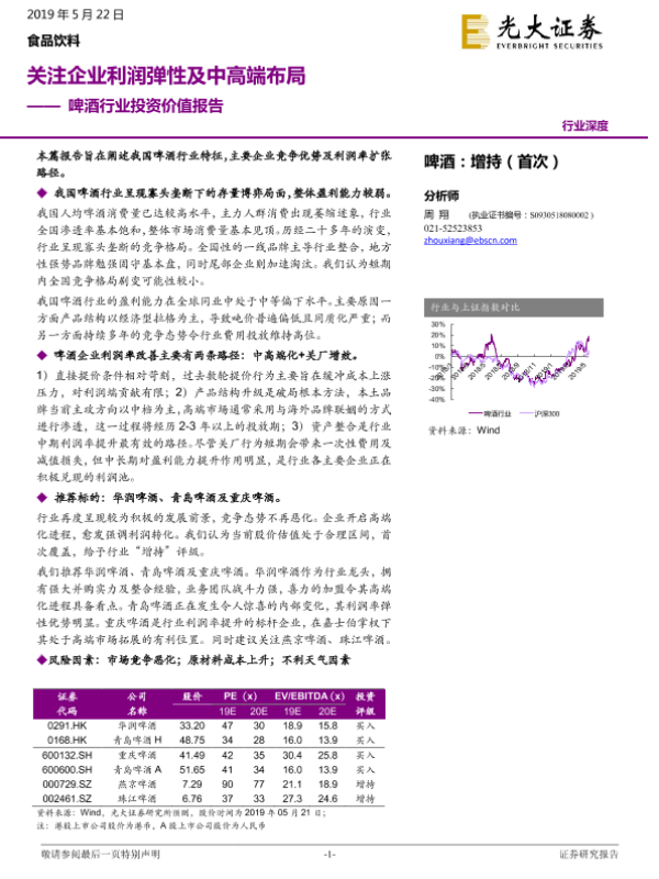 【光大证券】【20190522】20190522-光大证券-啤酒行业投资价值报告:关注企业利润弹性及中高端布局-70页