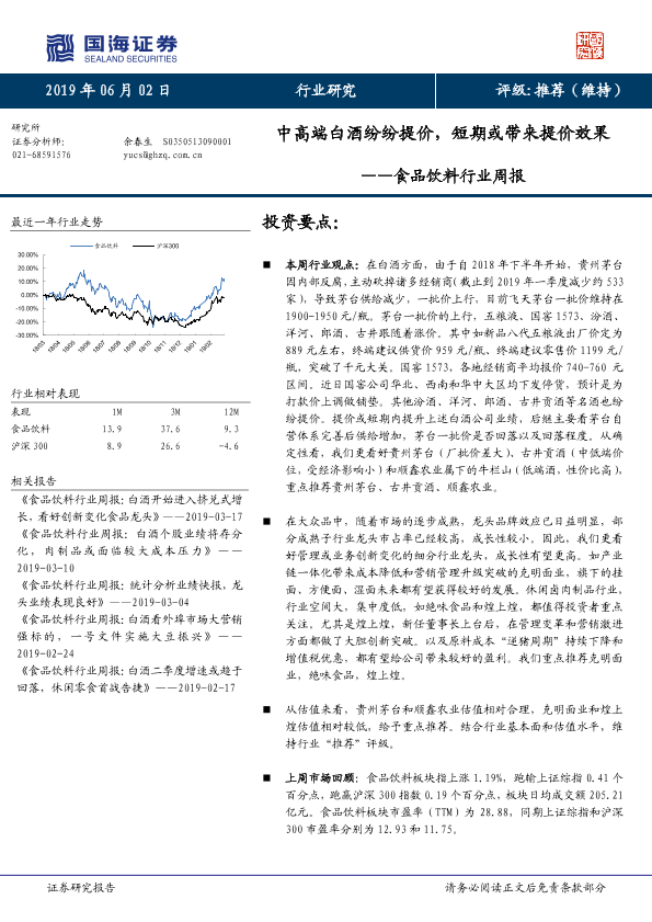 【国海证券】【20190602】20190602-国海证券-食品饮料行业周报:中高端白酒纷纷提价,短期或带来提价效果-22页