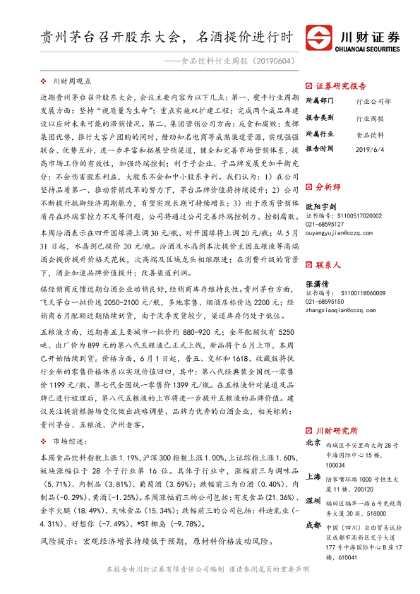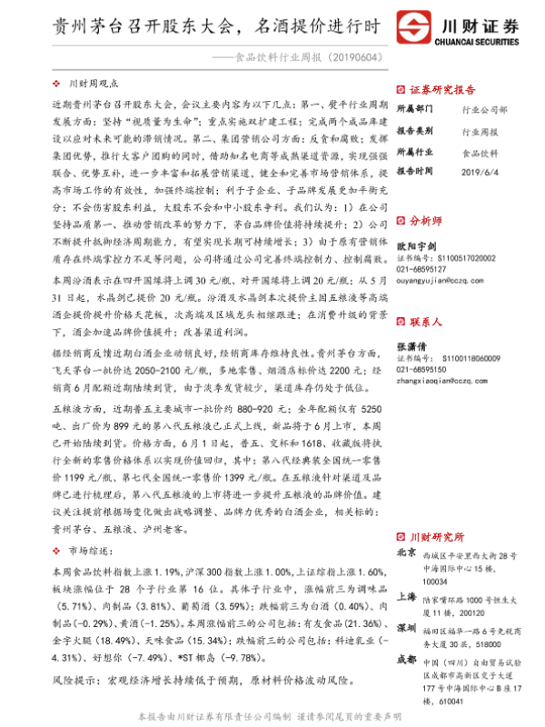 【川财证券】【20190604】20190604-川财证券-食品饮料行业周报:贵州茅台召开股东大会,名酒提价进行时-16页