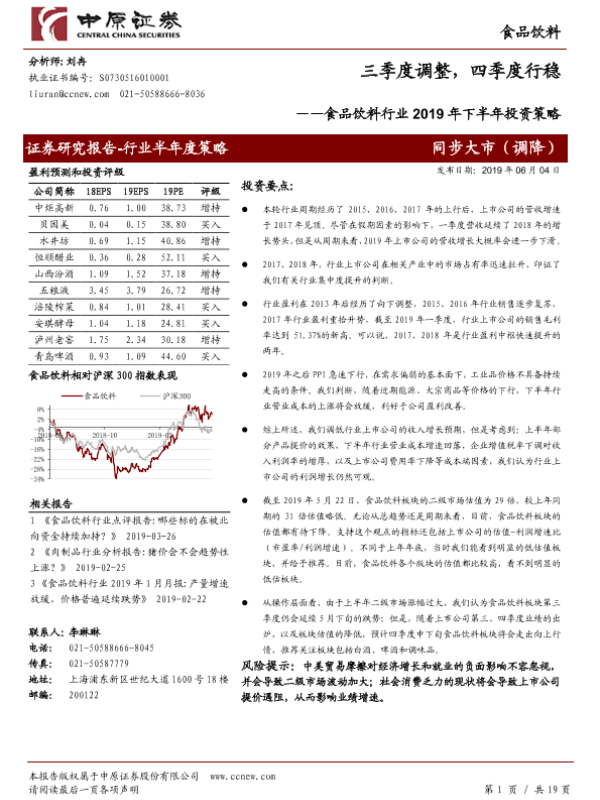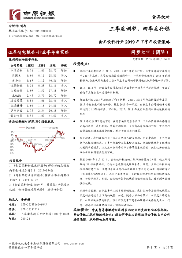 【中原证券】【20190604】食品饮料行业2019年下半年投资策略:三季度调整,四季度行稳-19页