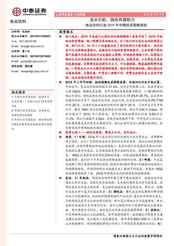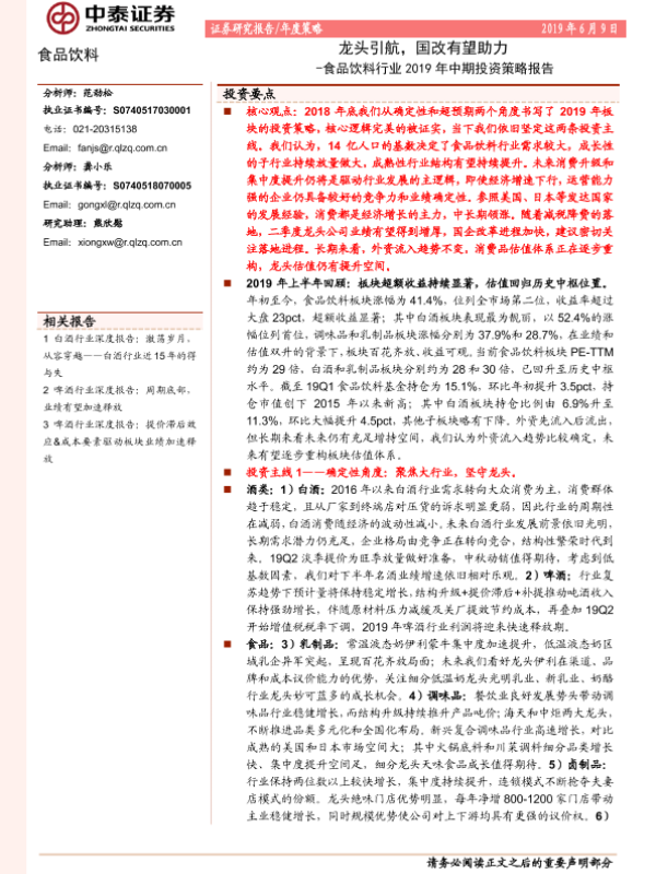 【中泰证券】【20190609】食品饮料行业2019年中期投资策略报告:龙头引航,国改有望助力-44页