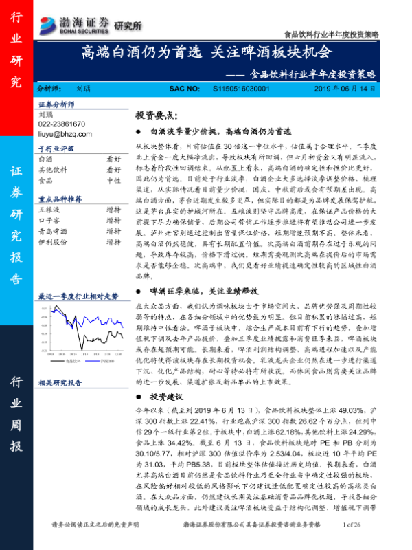 【渤海证券】【20190614】食品饮料行业半年度投资策略:高端白酒仍为首选 关注啤酒板块机会-26页