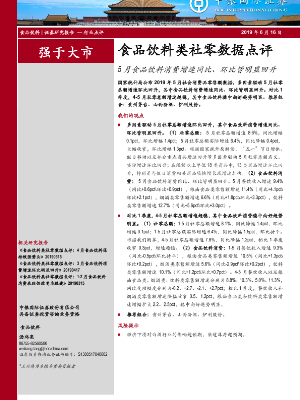 【中银证券】【20190616】食品饮料类社零数据点评:5月食品饮料消费增速同比、环比皆明显回升-4页