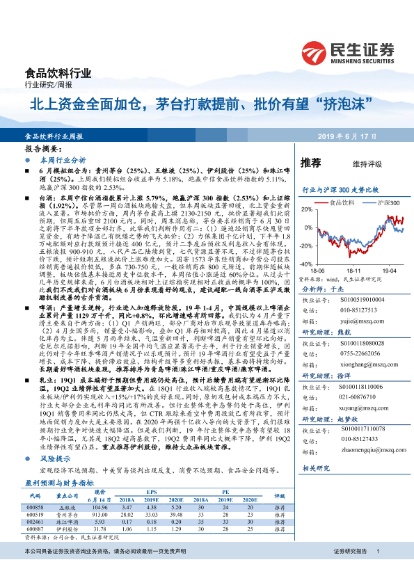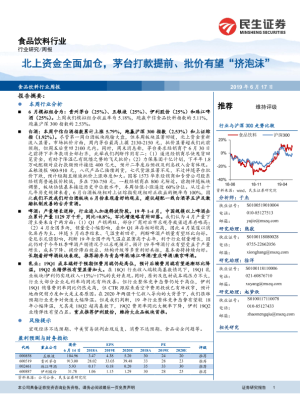 【民生证券】【20190617】20190617-民生证券-食品饮料行业周报:北上资金全面加仓,茅台打款提前、批价有望“挤泡沫”-19页