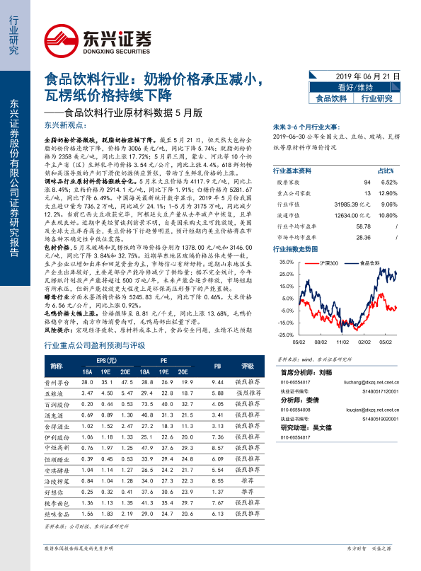 【东兴证券】【20190621】食品饮料行业原材料数据5月版:奶粉价格承压减小,瓦楞纸价格持续下降-5页