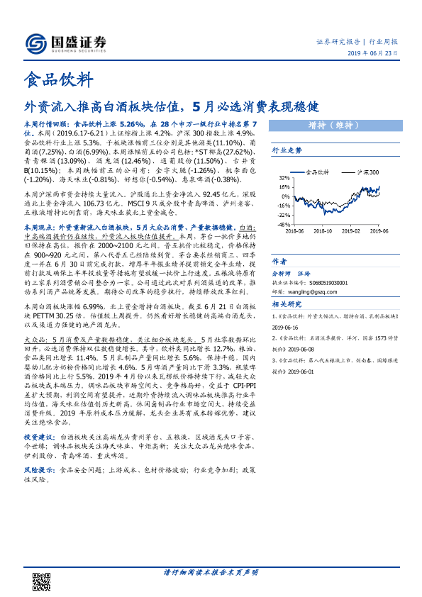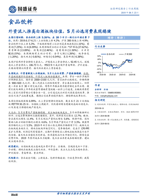 【国盛证券】【20190623】食品饮料行业周报:外资流入推高白酒板块估值,5月必选消费表现稳健-17页