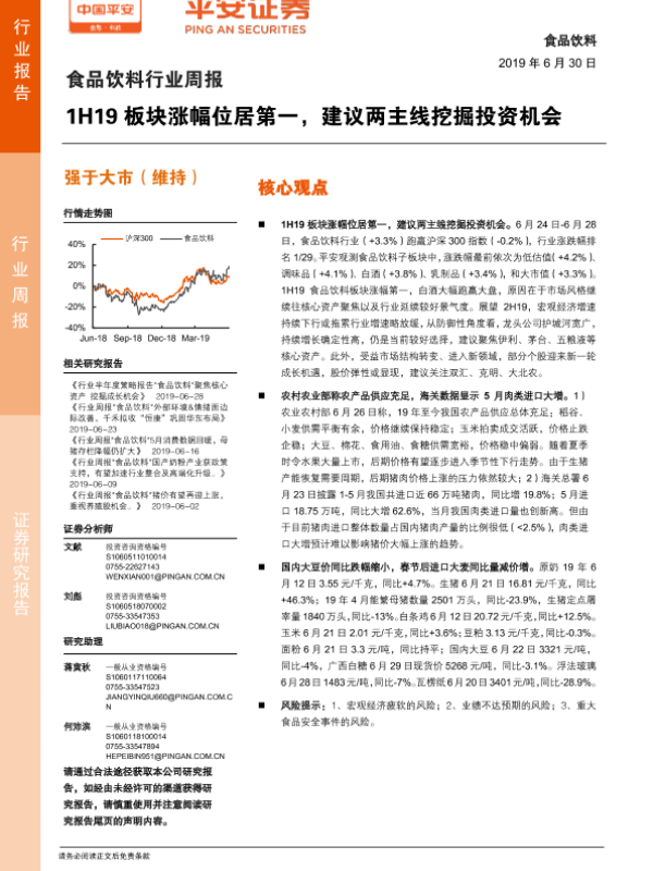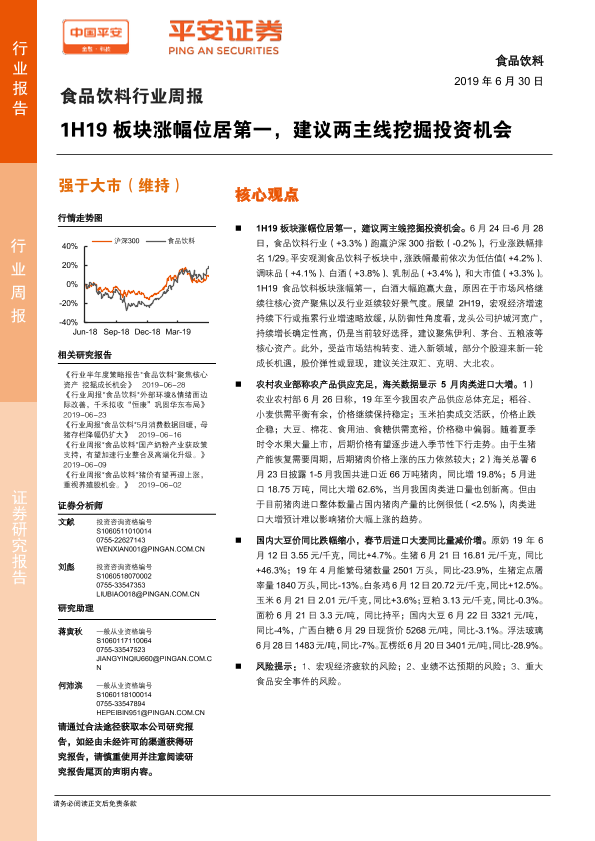 【平安证券】【20190630】20190630-平安证券-食品饮料行业周报:1H19板块涨幅位居第一,建议两主线挖掘投资机会-6页