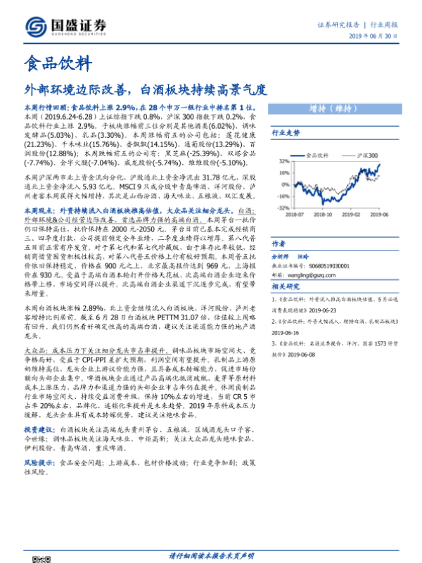 【国盛证券】【20190630】20190630-国盛证券-食品饮料行业周报:外部环境边际改善,白酒板块持续高景气度-17页