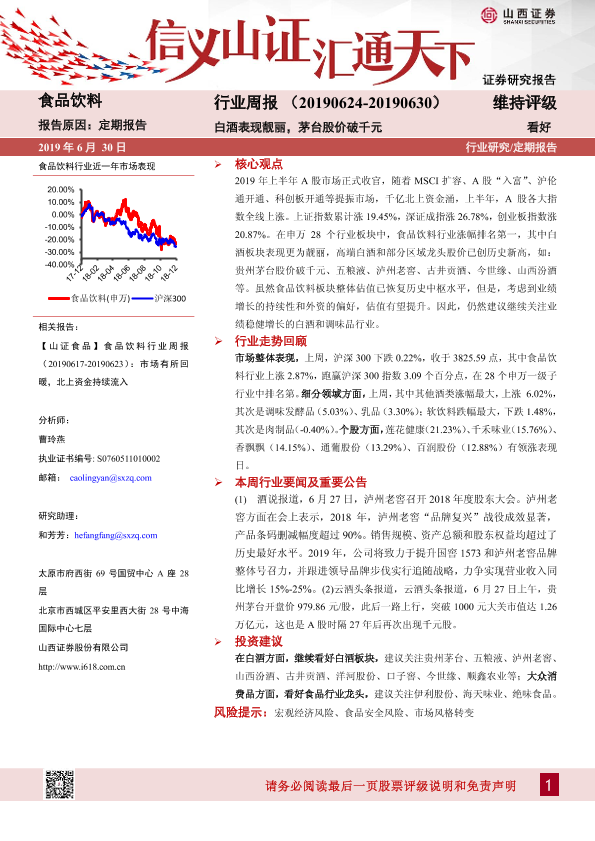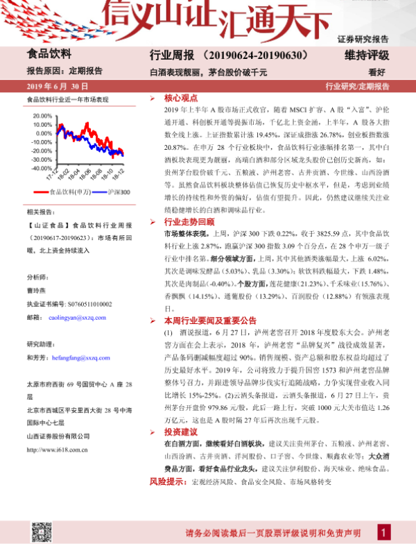 【山西证券】【20190630】食品饮料行业周报:白酒表现靓丽,茅台股价破千元-9页