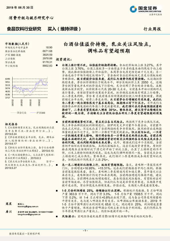 【国金证券】【20190630】20190630-国金证券-食品饮料行业研究周报:白酒估值溢价持续,乳业关注风险点,调味品有望超预期-21页