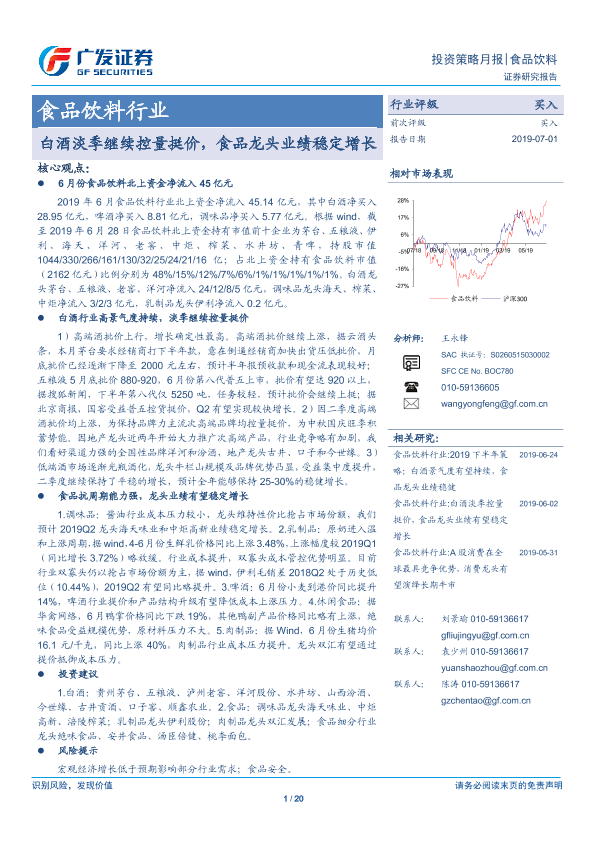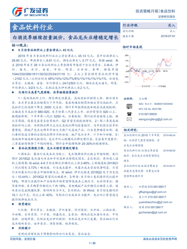 【广发证券】【20190701】20190701-广发证券-食品饮料行业投资策略月报:白酒淡季继续控量挺价,食品龙头业绩稳定增长-20页
