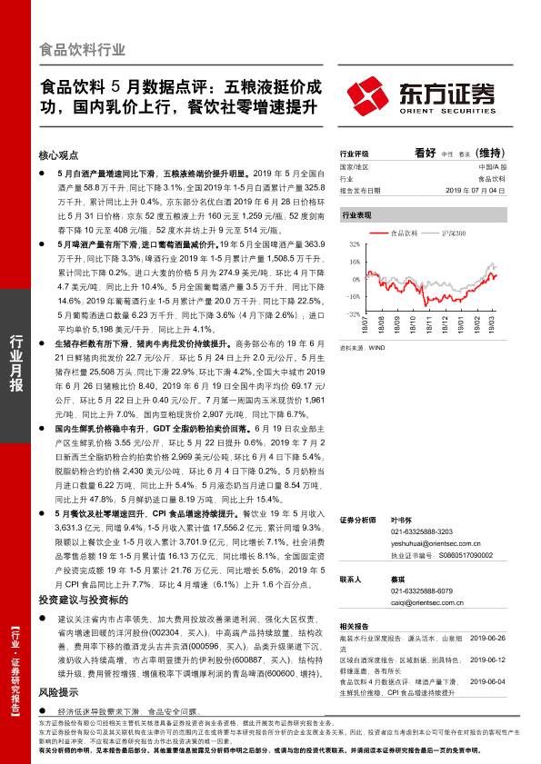 【东方证券】【20190704】食品饮料5月数据点评:五粮液挺价成功,国内乳价上行,餐饮社零增速提升-14页