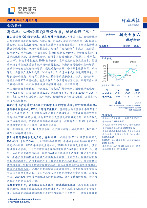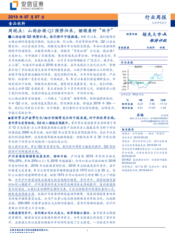 【安信证券】【20190707】食品饮料行业周视点:山西汾酒Q2强势归来,继续看好“双中”-22页
