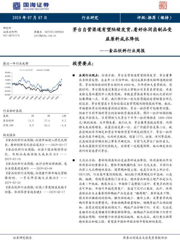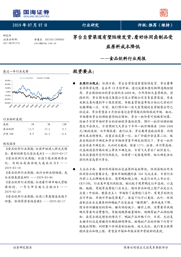 【国海证券】【20190707】食品饮料行业周报:茅台自营渠道有望陆续发货,看好休闲卤制品受益原料成本降低-19页